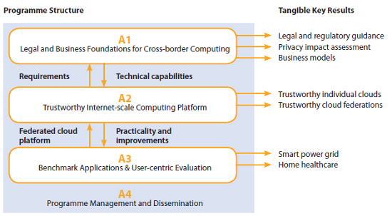 - Identifying and addressing the legal and business implications and opportunities of a widespread use of infrastructure clouds, contributing to building a regulatory framework for enabling resilient and privacy-enhanced cross-border infrastructure clouds.